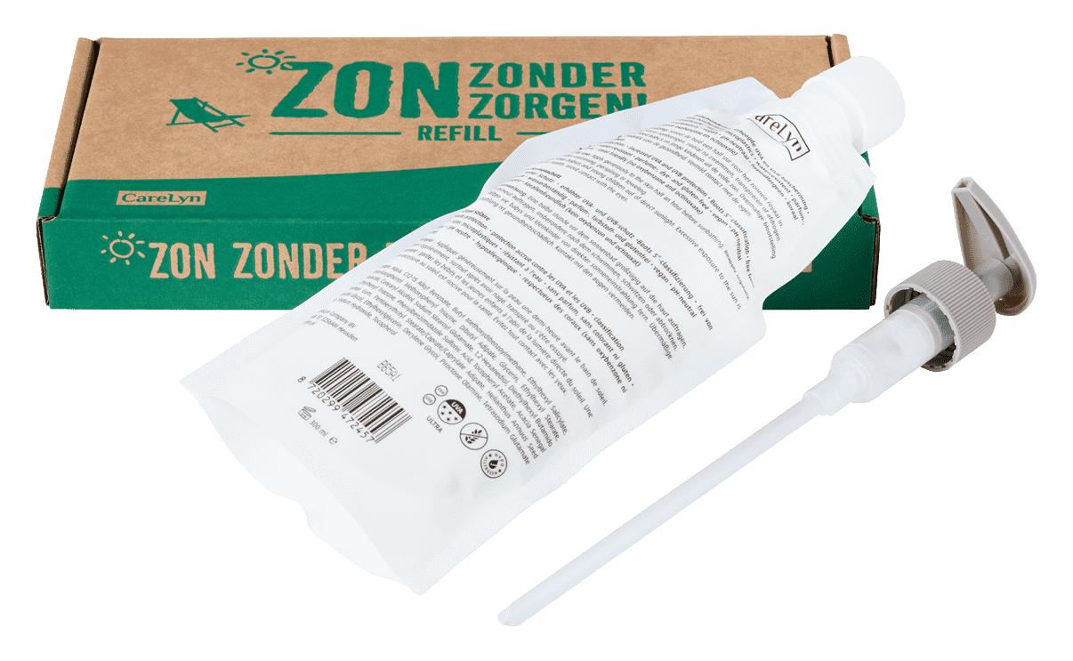 De dispenser, gemaakt van suikerriet en volledig recyclebaar, is eenvoudig te hervullen door een pouch van 300 ML CareLyn zonnebrandcrème.