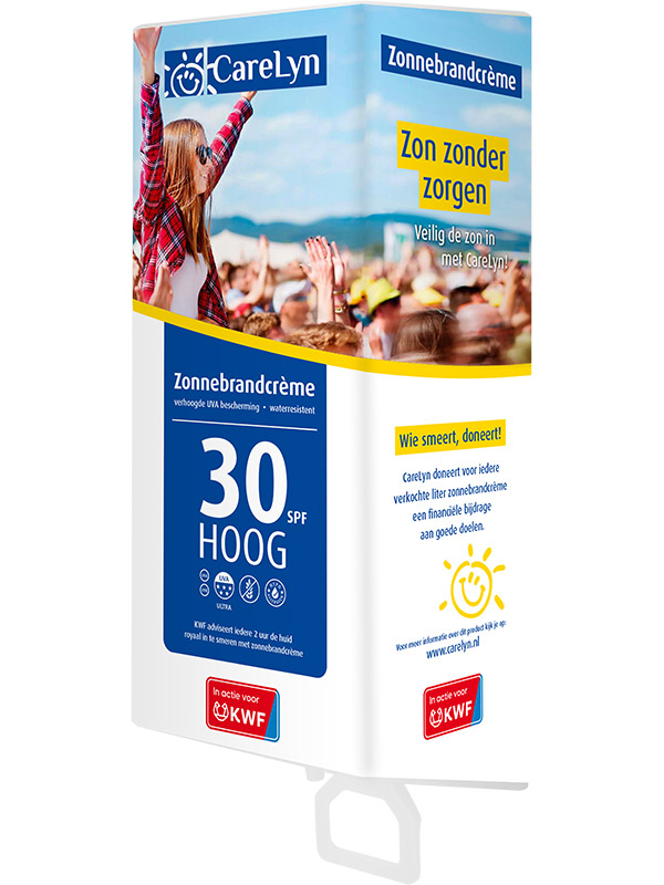 Je zorgt voor een goed programma, een geweldige line-up, een fijne sfeer én voor veiligheid. Bezoekers mogen uit veiligheidsoverwegingen doorgaans geen flesjes zonnebrandcrème meenemen. Hoeft ook niet, als op centrale plaatsen dispensers met crème van CareLyn worden geplaatst. Opvallend, kan niemand omheen. Makkelijk en hygiënisch ook. En eco-bewust, want zo’n literflacon scheelt heel wat plastic flesjes en tubes. We kunnen het publiek ook attenderen en informeren over het belang van een goede huidbescherming. En als je wilt, regelen we zelfs een ‘smeerteam’ dat je bezoekers voorziet van zonnebrandcrème om te smeren. Kijk, dat is nog eens een gastvrij gebaar!